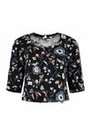The Alice Mesh Blouse is a black blouse with a floral mesh pattern. The short sleeves fall just above the elbow, and it comes with a black lining. The floral design features a mix of colors, including denim blue, light blue, beige, and white. Some flowers are subtly accented with sequins, adding a feminine touch.