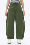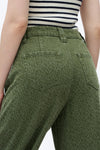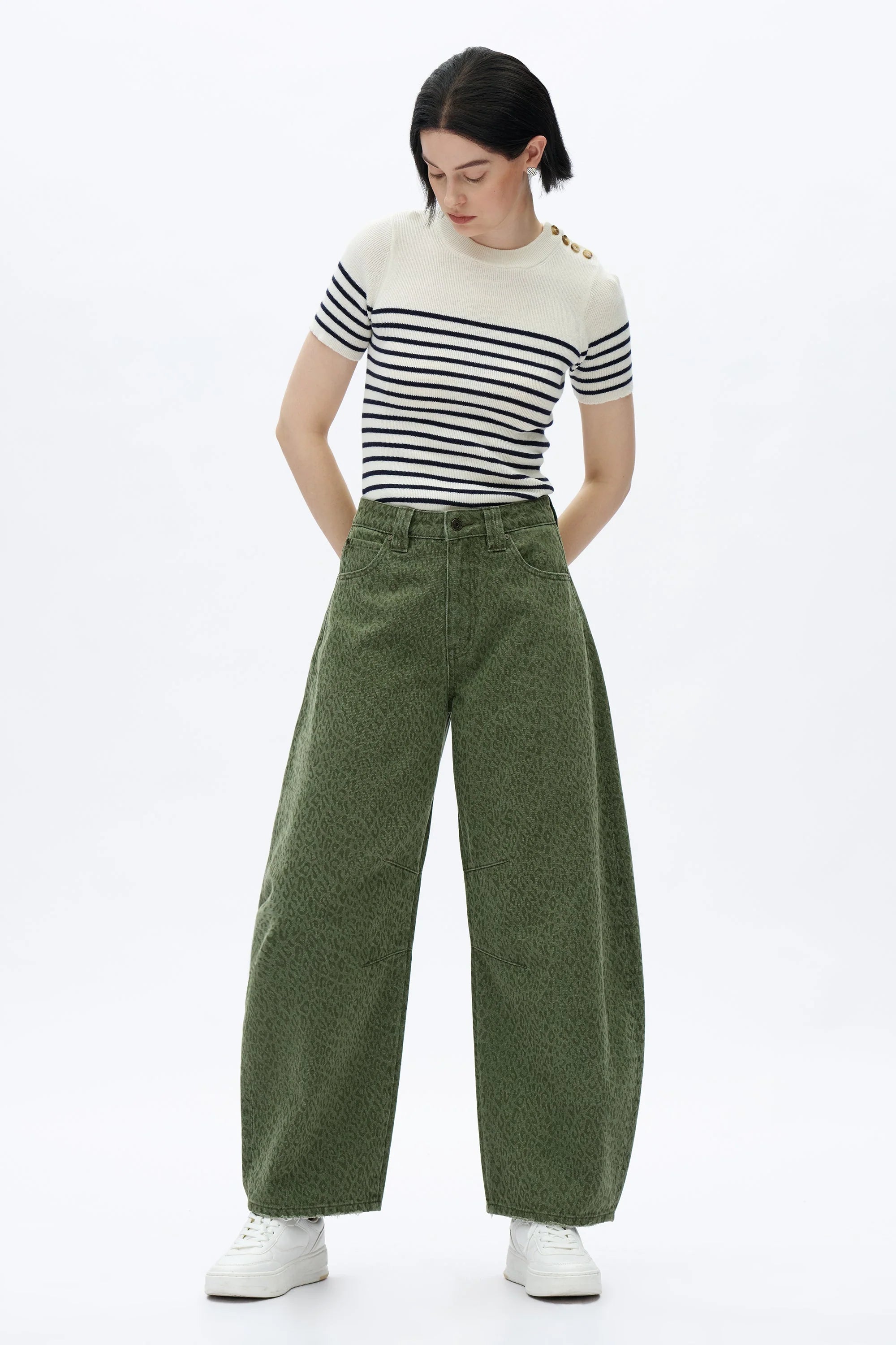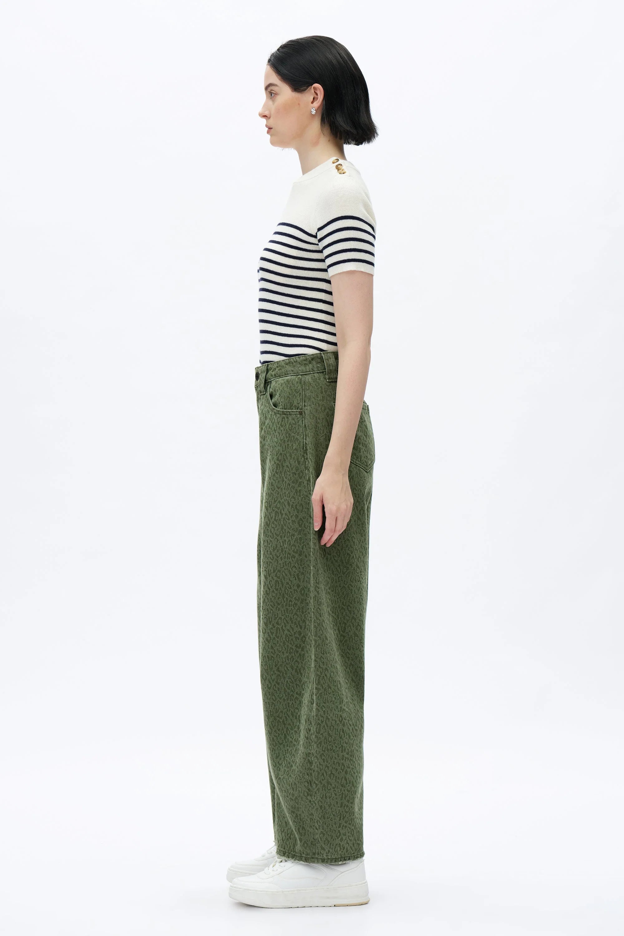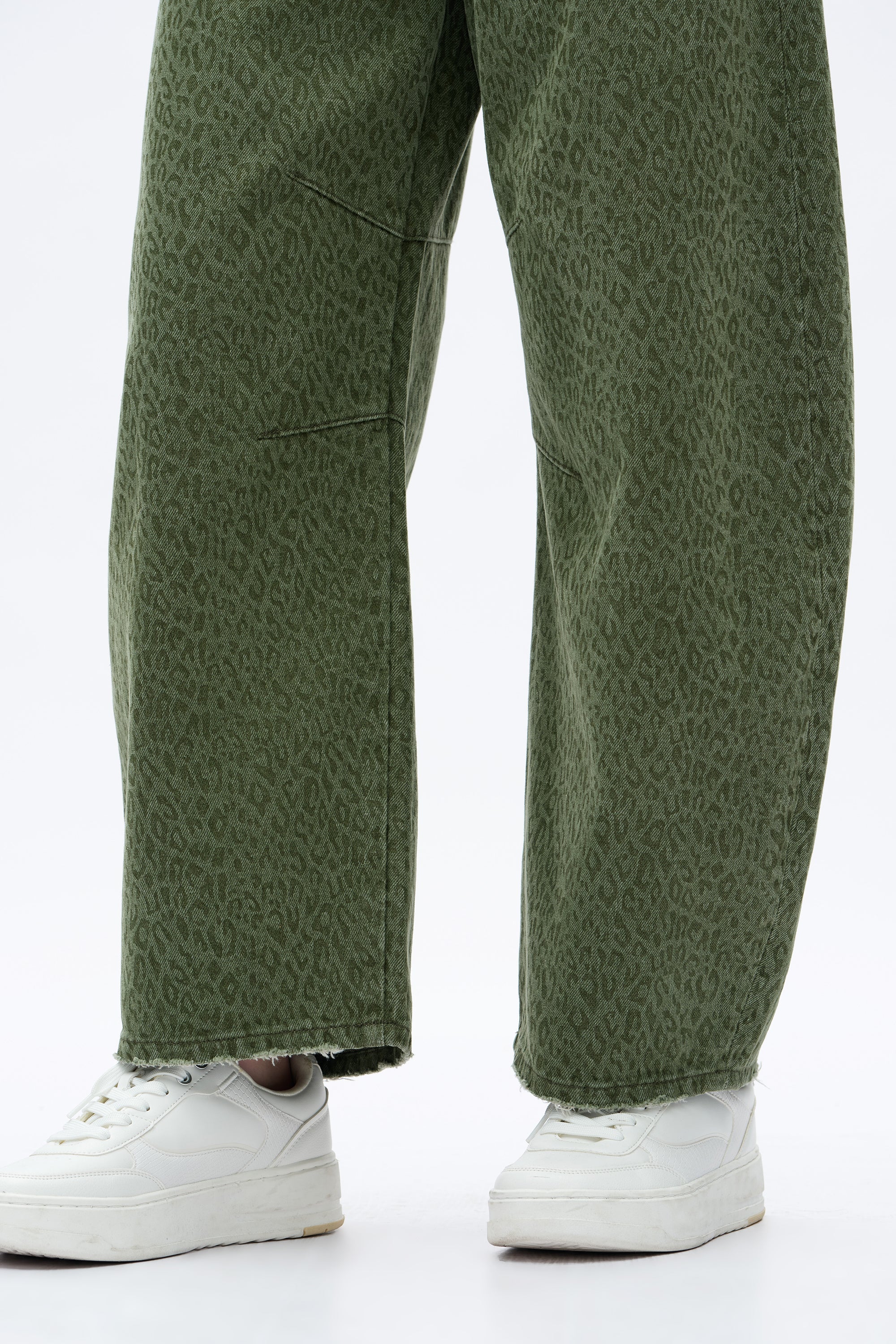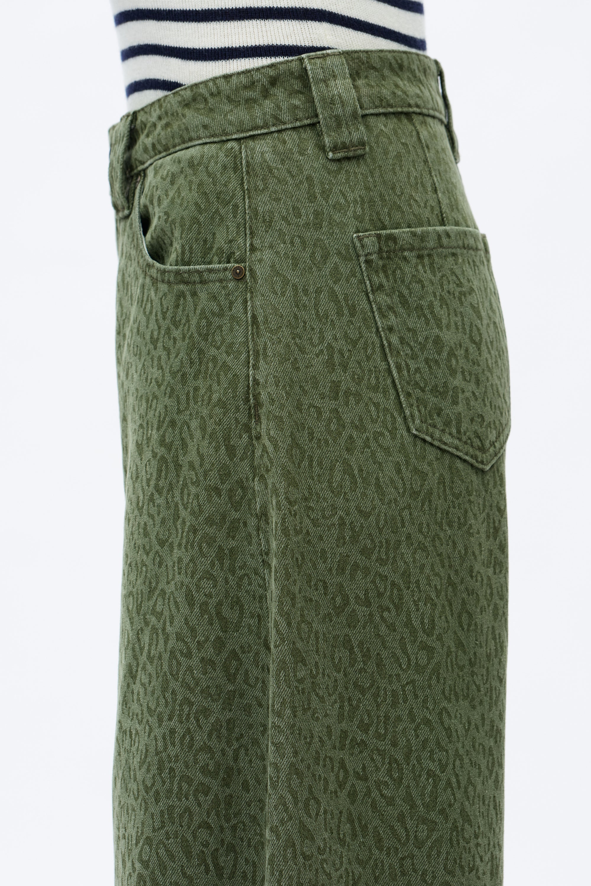 Effortless edge meets everyday comfort in the Leopard Haze Denim. These high-rise jeans feature a relaxed, drop-crotch silhouette with a curved, voluminous leg for a modern, laid-back shape. Made from soft green denim with a subtle leopard-inspired print, they bring just the right amount of statement to your look.