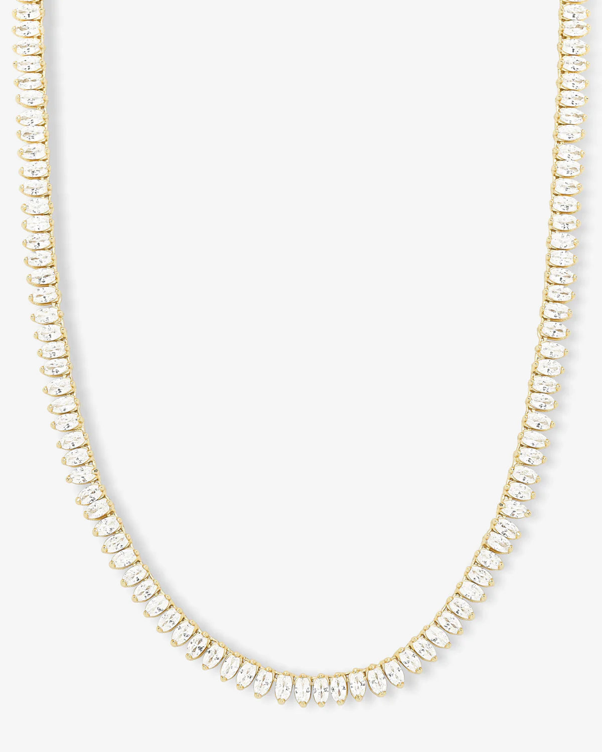 She is SO fine! Like the best-selling choker necklace, this marquise-style simulated diamond tennis necklace is the perfect combo of edgy meets glamorous in a size you’ll want to wear every day.