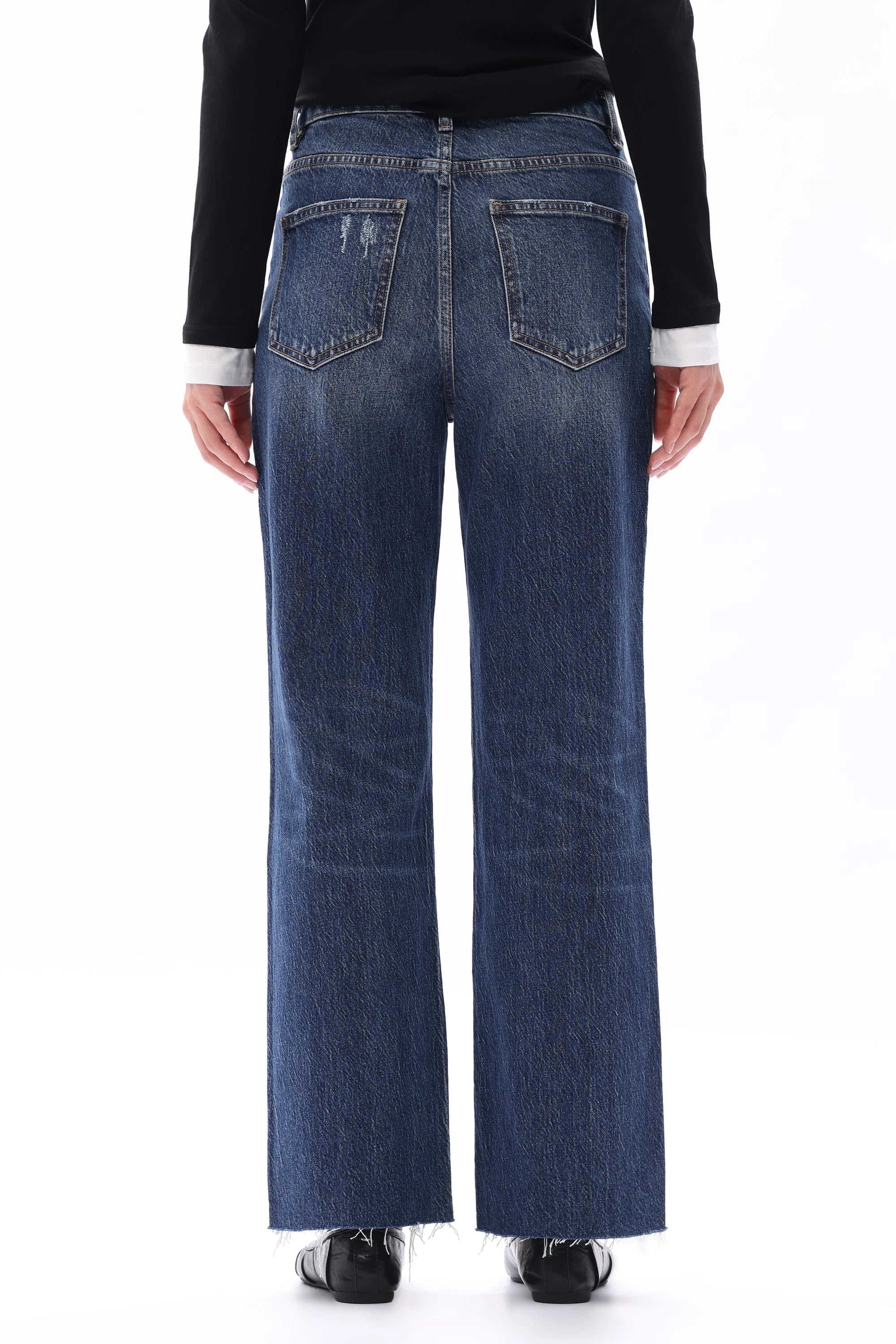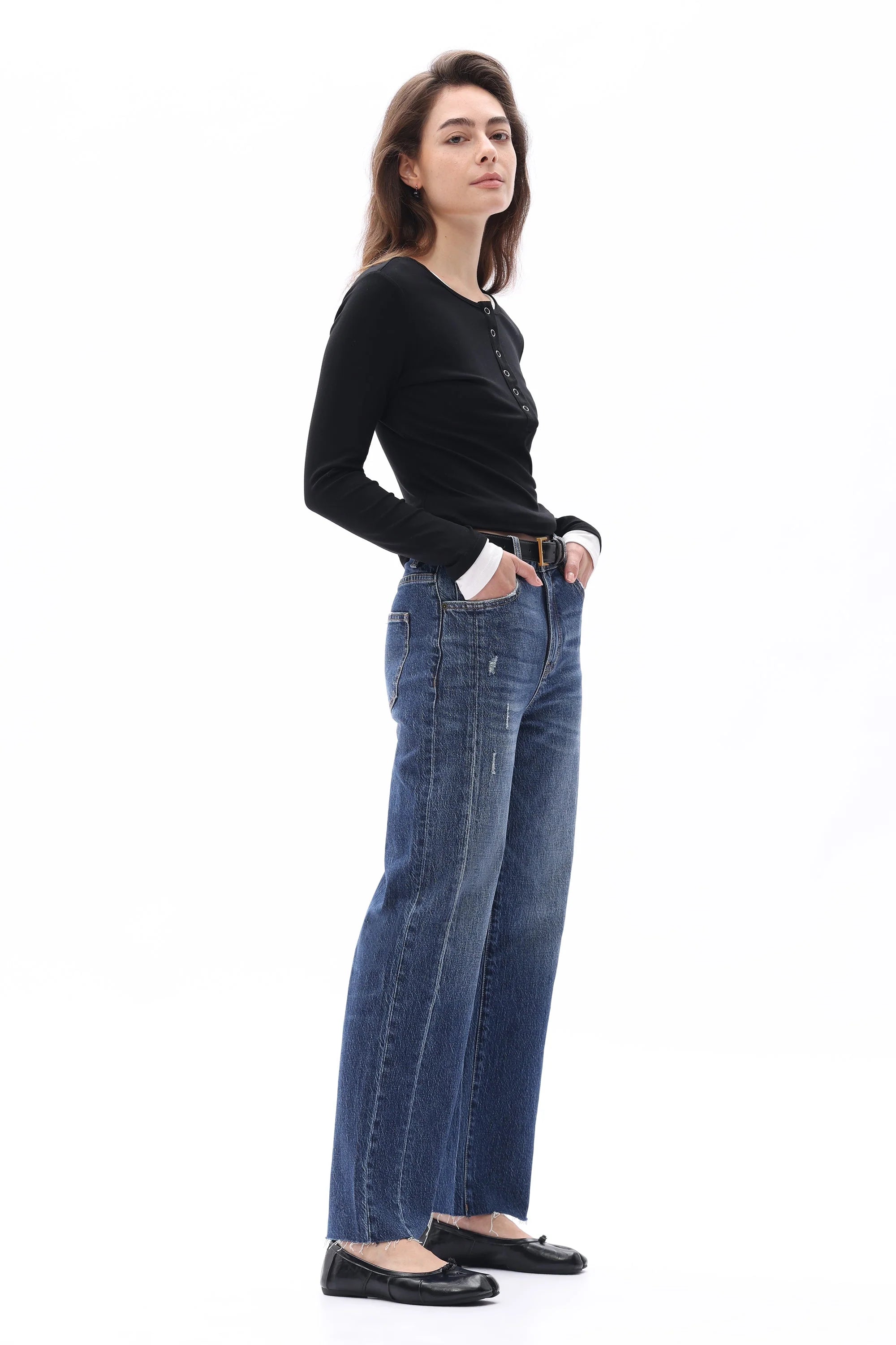 A timeless straight-leg silhouette with an easy, relaxed feel. These high-rise jeans feature a lightly distressed finish for a true vintage look, complete with a classic five-pocket design. Crafted with just a touch of stretch, they offer comfort while maintaining their structured shape. Flattering and effortless, they’re a go-to denim style for a wide range of body types.