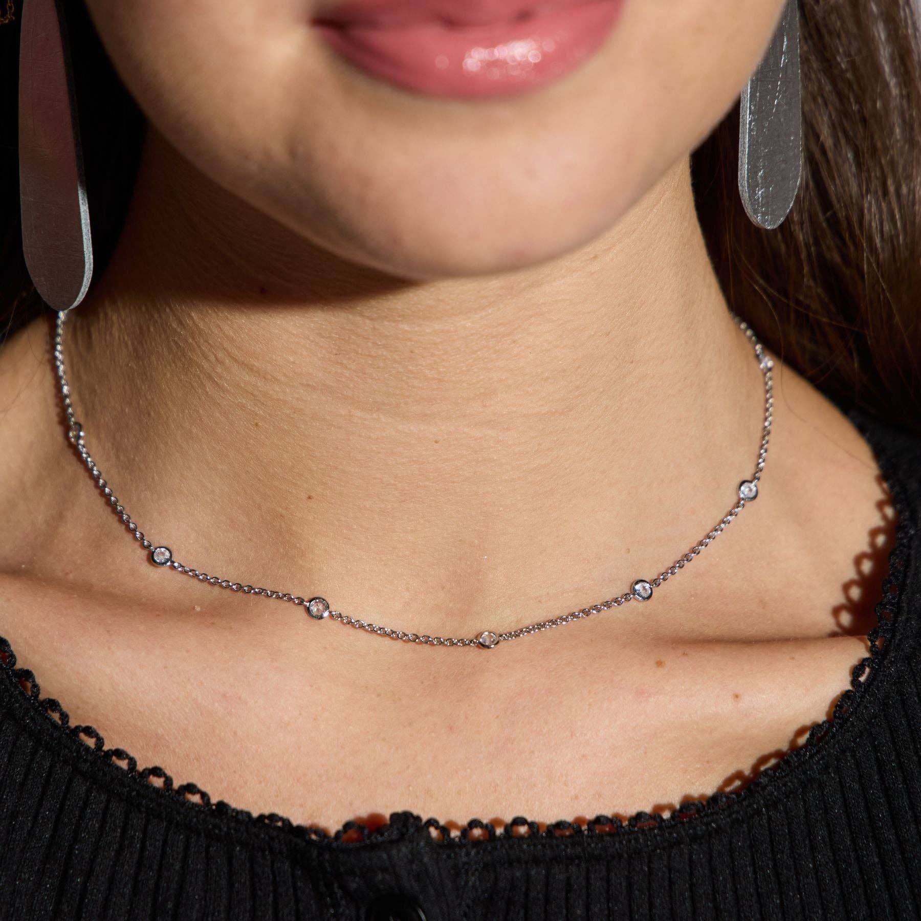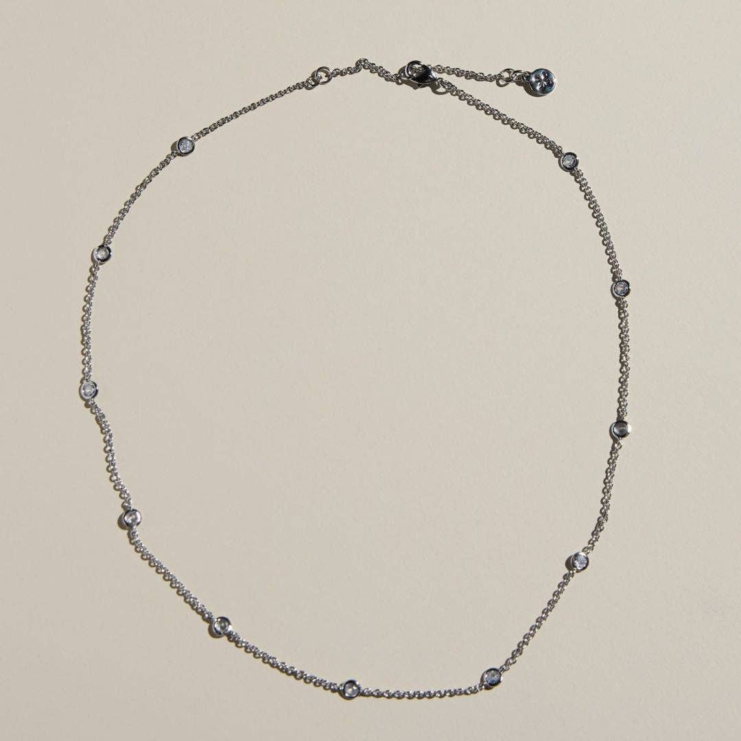 Dainty and minimalist, the CZ Delicate Saturn Chain Necklace is an interlinking station chain designed to delicately sit on your neckline. Upgrade your necklace stack with this rhodium-plated staple, show off your favorite attachable charms, or wear it alone for a timeless touch.
