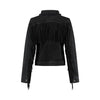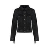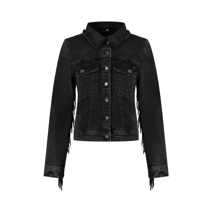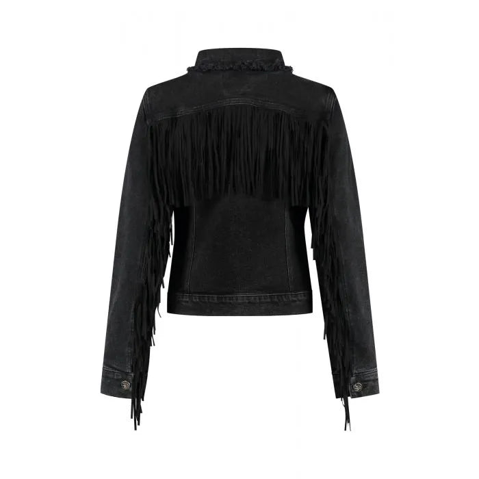 Celine Jacket by Florez – Add a bold western touch to your outfit with this black denim jacket. Crafted from sturdy denim, it stands out with fringes across the back and along the sleeves, creating movement and a striking look. The edgy cut and black wash make it a versatile piece that’s easy to style.