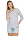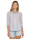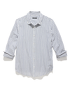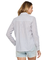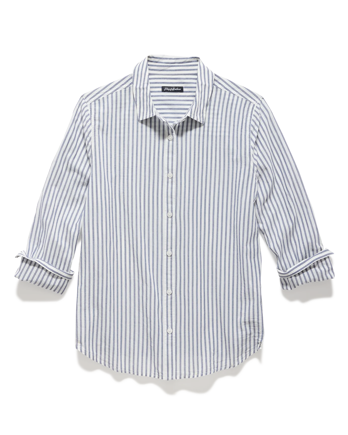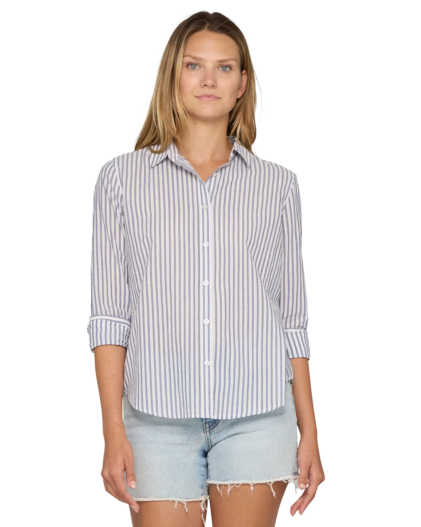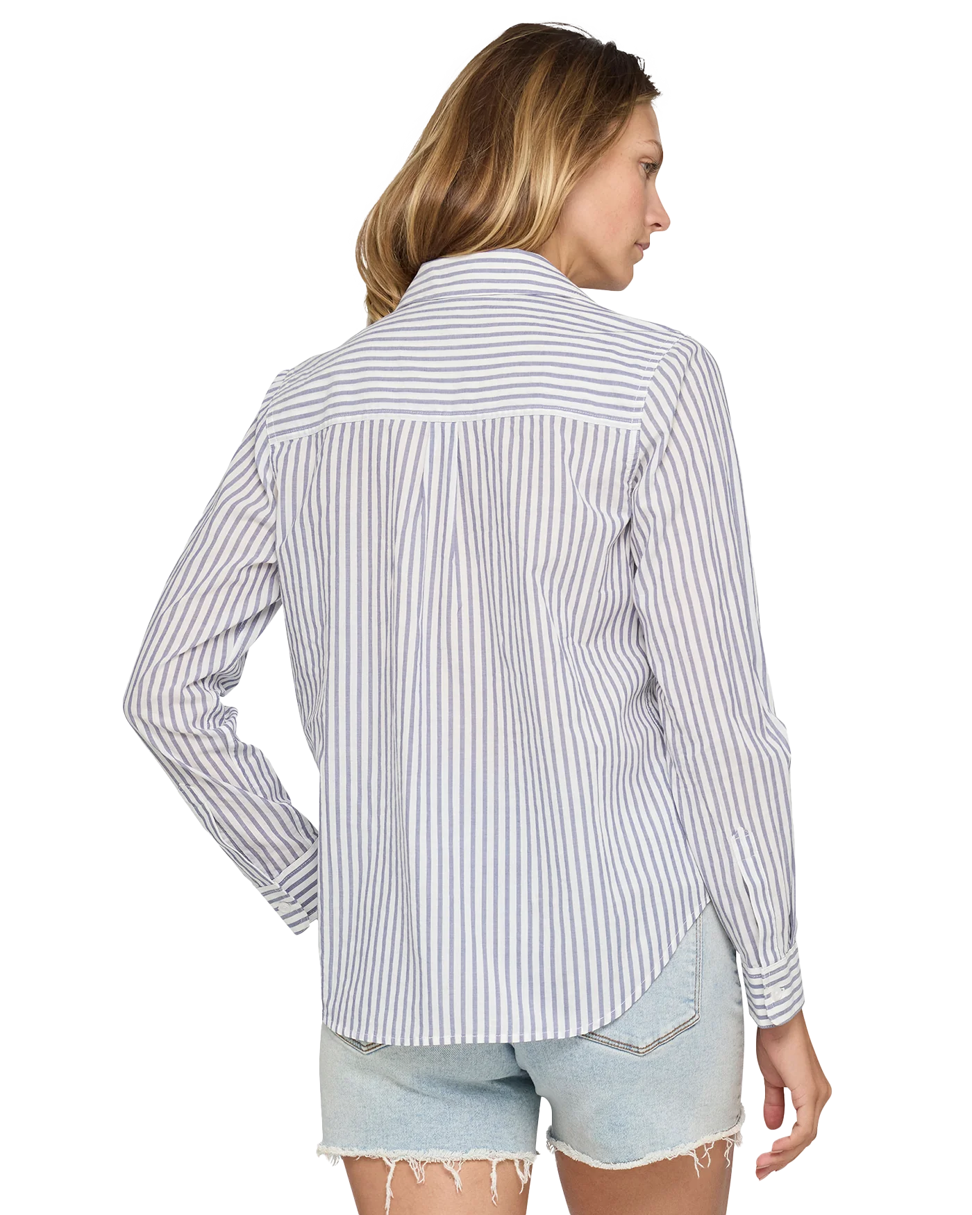 Cute and casual vibes come together to create this timeless style. Lightweight and breathable woven cotton fabric, with a timeless striped pattern, shapes a classic collared neckline and long sleeves with drop shoulders and button cuffs. The relaxed bodice features a functional button placket at the center before ending at a slightly curved hem.