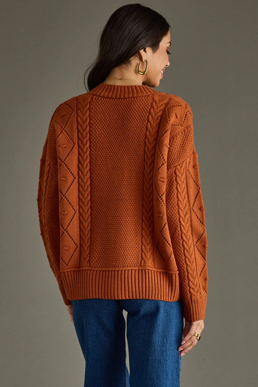 Cozy up in effortless style with this decorative knit cardigan. Designed in a warm rust hue, it features a classic button-front closure, long sleeves, and an oversized fit that’s perfect for layering. Crafted from soft 100% acrylic, this imported piece is as comfortable as it is versatile—ideal for adding a pop of color and texture to your fall wardrobe.