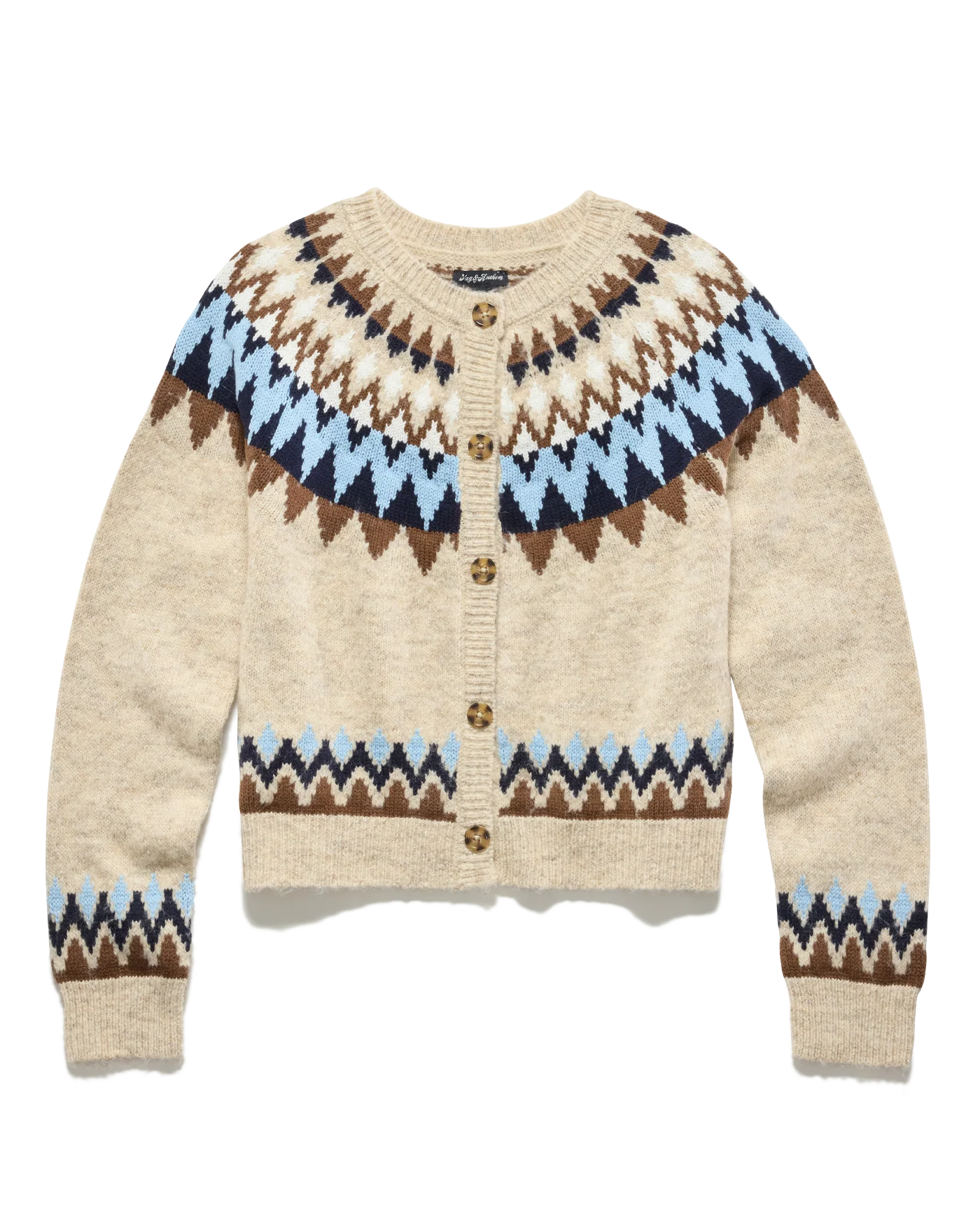 Not just for the ski slopes, our Fair Isle-inspired sweater is a soft and cozy must-have. The full button cardigan is a medium-gauge, brushed knit composition shaped with a classic crew neckline. Long sleeves with drop shoulders shape the relaxed body. Ribbed knit accents the neckline, cuffs, and hem.