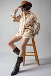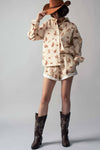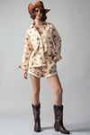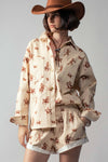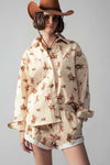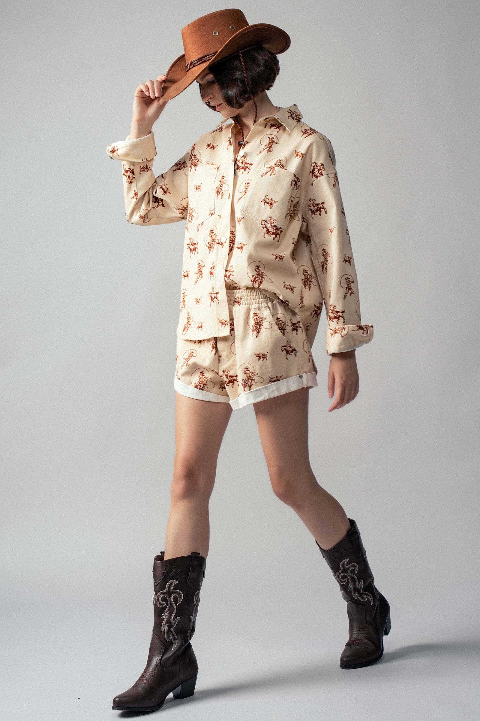 This relaxed-fit button-up shirt combines authentic western style with modern touches, featuring a distinctive cowboy and bull-riding print pattern. Crafted from premium woven fabric, it offers excellent drape, functional chest pockets with gold-tone button closures, and a back pleat for added structure and comfort.