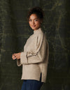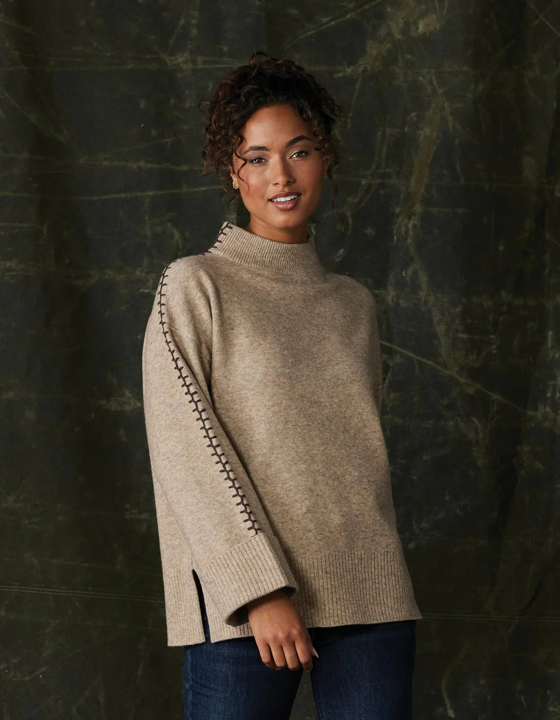 Oh-so-soft. This sweater has an effortlessly cozy and flexible fit. Its oversized silhouette hits at the hip for a relaxed look. Features a rib stand collar, foldover rib sleeve cuffs, and dropped shoulders. The novelty contrast color blanket stitch along the shoulders and outer sleeves adds a distinctive touch.