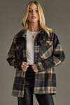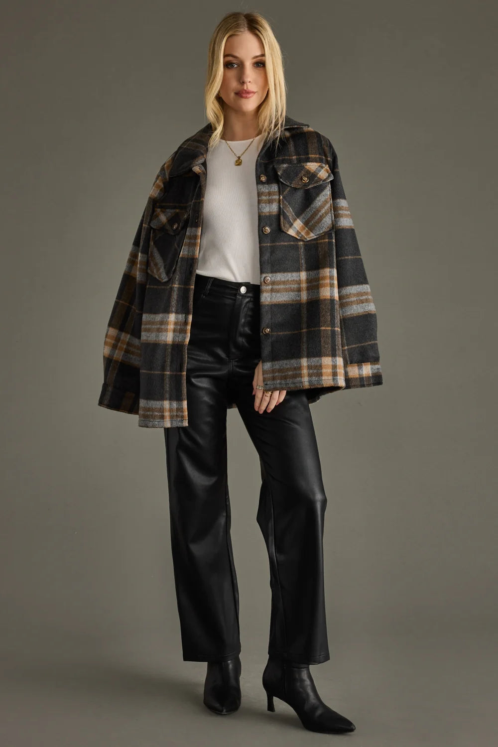 Step into effortless style with the Karissa Plaid Jacket. Featuring a classic black, tan, and gray plaid pattern, this jacket is fully lined for comfort and structure. Designed with a button-front closure, two front bust pockets, and convenient side pockets, it’s both functional and fashion-forward.