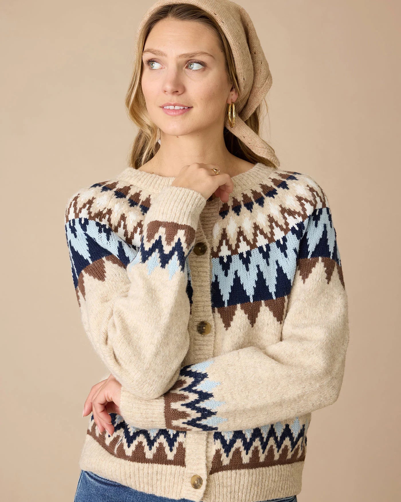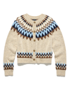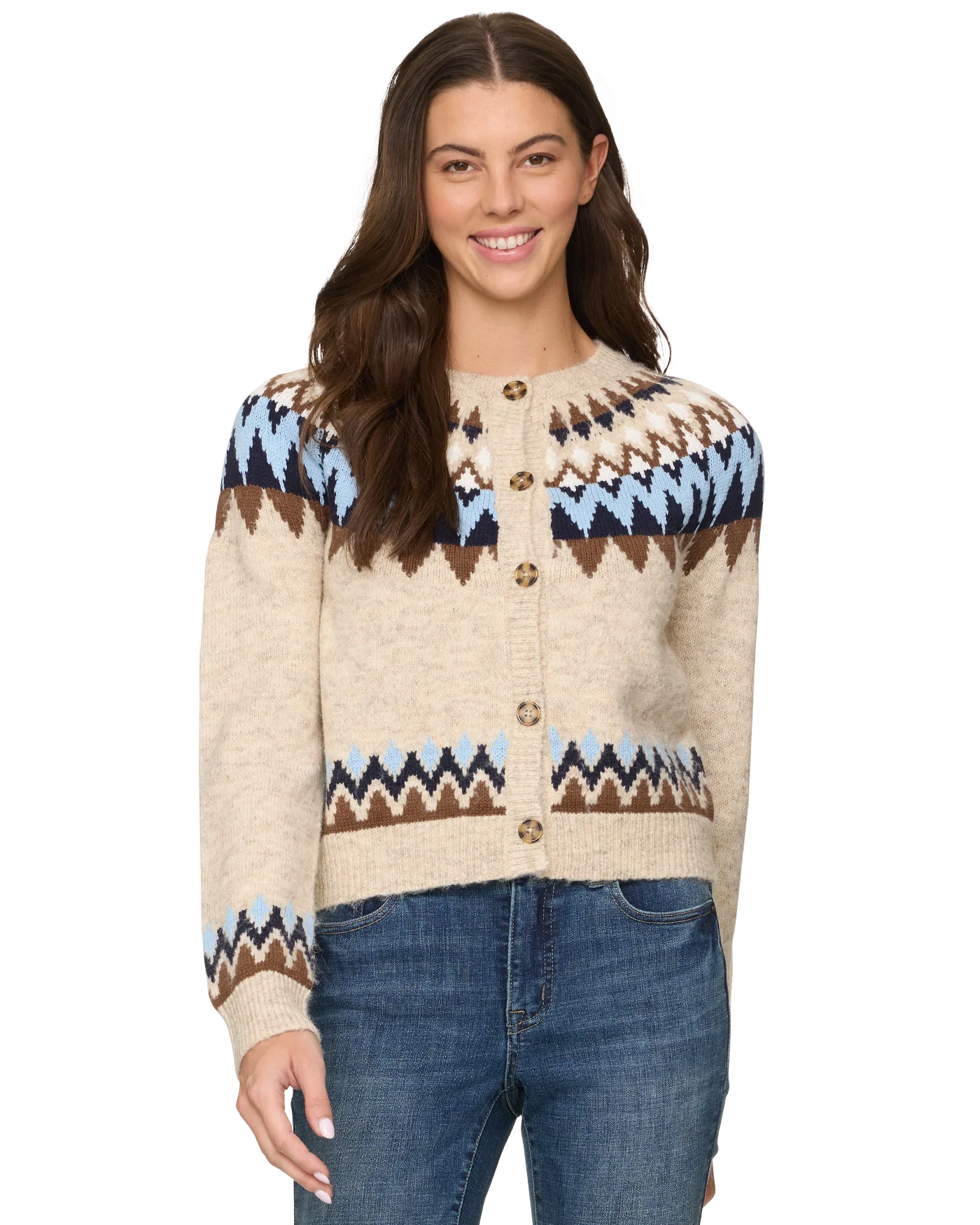Not just for the ski slopes, our Fair Isle-inspired sweater is a soft and cozy must-have. The full button cardigan is a medium-gauge, brushed knit composition shaped with a classic crew neckline. Long sleeves with drop shoulders shape the relaxed body. Ribbed knit accents the neckline, cuffs, and hem.